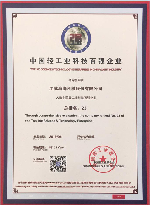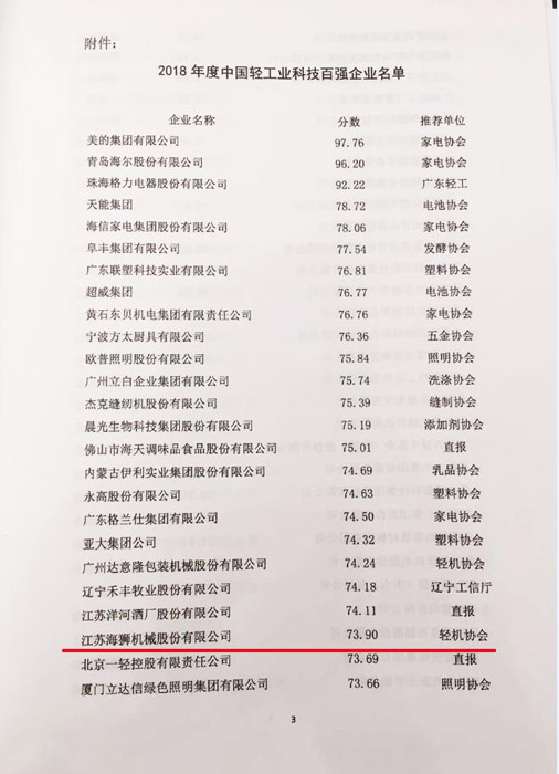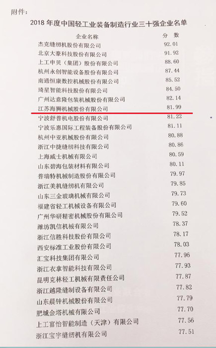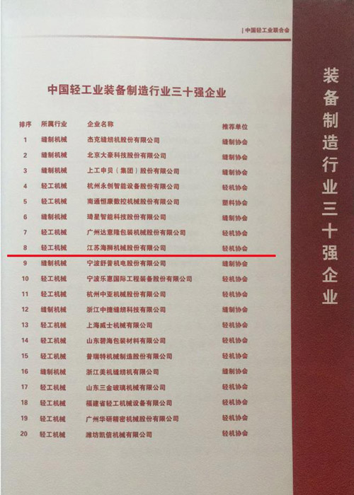 In order to accelerate the strong country construction and promote the development of the light industrial equipment manufacturing industry ,in the principle of preciseness, fairness and science ,the China light industry federation has organized the evaluation of “top 30 enterprises in Chinese light industrial equipment manufacturing industry” and “top 100 enterprises in Chinese light industrial technology industry” in 2018 .